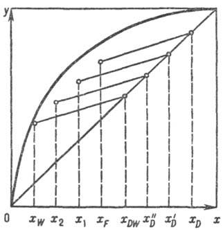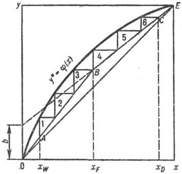 Для анализа работы колонны, расчета состава дистиллята и остатка и распределения концентраций ЛЛК по высоте аппарата используют понятие о теоретической ступени разделения, или теоретической тарелке (ТТ). Такая ступень (тарелка) соответствует нек-рому гипотетич. участку аппарата, где жидкость и покидающий ступень пар находятся в равновесии. Число ТТ (nт), необходимое для получения дистиллята и остатка заданного состава, можно найти графически с помощью у-х-диаграммы (рис. 2), описывающей зависимость между равновесными молярными концентрациями паровой (у*) и жидкой (х) фаз. Для определения пт на графике строят (см. Массообмен) ступенчатую линию между равновесной кривой у* = f(х) и ломаной линией AВС. Линия АВ отвечает ур-нию (3), линия ВС— ур-нию (2). В представленном примере для разделения исходной смеси на дистиллят состава xD и остаток состава xW требуется по 3 ТТ в укрепляющей и исчерпывающей частях колонны. Более точный метод расчета составов дистиллята и остатка при известном числе ТТ основан на последоват. вычислении составов пара и жидкости на каждой тарелке с использованием ур-ний рабочих линий и теплового баланса. Учитываются также изменения потоков по высоте колонны вследствие неравенства теплот испарения компонентов.