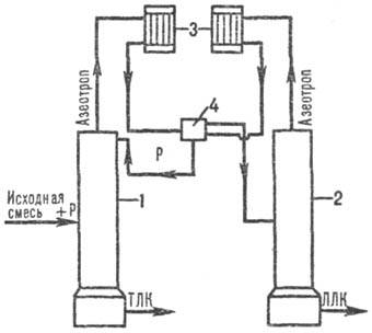 Экстрактивную ректификацию используют обычно для разделения смесей близкокипящих компонентов, характеризующихся низкой относит. летучестью а. Разделение таких смесей приходится проводить в колоннах с очень большим числом ТТ и высоким расходом пара из-за необходимости поддерживать большое R. Однако если к исходной смеси добавить практически нелетучий разделяющий компонент, способный повысить a осн. компонентов, разделение можно осуществить в двух ректификац. колоннах. На одну из верх. тарелок первой колонны подается разделяющий агент, к-рый раств. в потоке флегмы и повышает а смеси, в результате чего в виде дистиллята выделяется ЛЛК, а в виде остатка-смесь ТЛК и разделяющего агента. Эта смесь направляется в середину второй колонны, где, в свою очередь, разделяется на ТЛК (дистиллят) и остаток (разделяющий агент), к-рый возвращается в первую колонну.