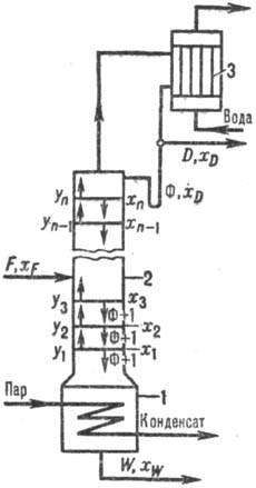 Рис. 1. Ректификационная установка непрерывного действия: 1 -куб-испаритель; 2-колонна; 3-дефлегматор.