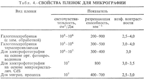 При получения микроформ на несеребряных материалах используют фотопроводящие пленки, применяемые в фототермопластич. фотографии, электрофотографич. процессах с жидкостным проявлением, а также материалы для т. наз. миграц. процесса. В последнем случае материал состоит из пленочной подложки, прозрачного электропроводящего слоя и непрозрачного светочувствит. слоя из электроизолирующего полимерного связующего и фотопроводящих частиц размером 0,2-2 мкм. Скрытое электростатич. изображение, полученное электрофотографич. способом, проявляют размягчением связующего нагреванием или парами орг. р-рителя. Заряженные частицы притягиваются к подложке индуцир. зарядом, мигрируют по направлению к электропроводящему слою и образуют светопропускающие участки на непрозрачном фоне немигрировавших частиц; получается позитивное изображение. В результате проявления скрытого изображения в орг. р-рителе мигрировавшие частицы достигают электропроводящего слоя и закрепляются на нем связующим. Немигрировавшие частицы смываются р-рите-лем; таким образом получается негативное изображение. Время получения миграц. изображения 3-10 с. Характеристики пленок для микрографии приведены в табл. 4.