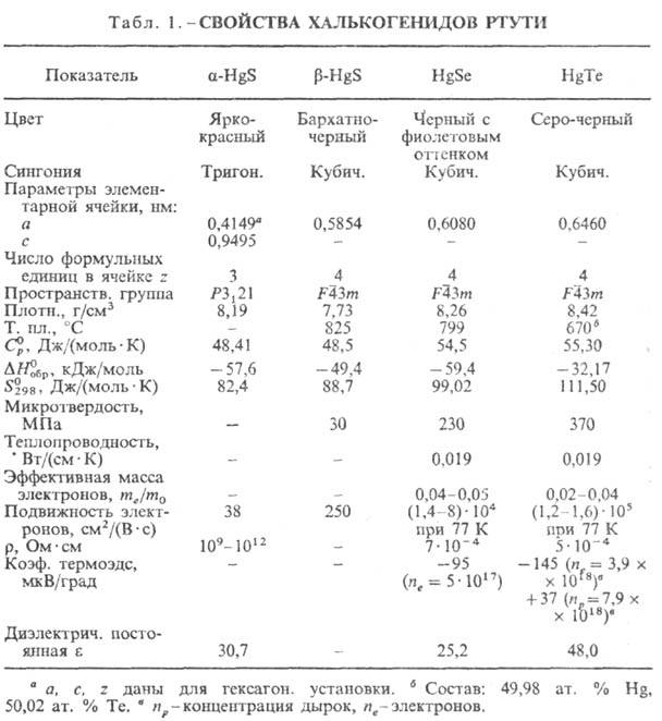 РТУТИ ХАЛЬКОГЕНИДЫ, соед. Hg с S, Se, Те общей ф-лы HgX (табл. 1). Сульфид HgS существует в двух модификациях-a (киноварь) и b (метациннабарит); т-ра перехода a