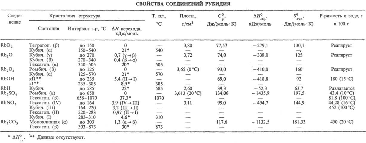 Рубидий обладает высокой реакц. способностью. Стандартный электродный потенциал —2,925 В. В О2 и на воздухе мгновенно окисляется с воспламенением, образуя надпероксид RbO2 с примесью пероксида Rb2O2. При ограниченном доступе О2 окисляется до оксида Rb2O. С водой реагирует обычно со взрывом с образованием гидроксида RbOH и выделением Н2. Взаимод. с сухим Н2 при нагр. под давлением 5-10 МПа в присут. катализатора с образованием гидрида RbH. Непосредственно соединяется с галогенами, давая рубидия галогениды. Образование сульфида Rb2S при растирании рубидия с порошком S сопровождается взрывом. При сплавлении рубидия в вакууме с Se и Те получают соотв. селенид Rb2Se и теллурид Rb2Te. С N2 в обычных условиях не взаимод., с жидким N2 в электрич. разряде между электродами, изготовленными из рубидия, образует нитрид Rb3N. Рубидий раств. в жидком NH3, алкиламинах и нек-рых полиэфирах, давая синие р-ры, содержащие сольватир. электроны и обладающие электронной проводимостью. С сухим газообразным NH3 рубидий при 200-300 РС образует амид RbNH2, с красным P при 400-430 °С-фосфид Rb2P5, с порошком графита при 200-350 °С- карбид C8Rb, а при более высоких T-pax-C24Rb, с ацетиленом - ацетиленид Rb2C2, с Si и Ge в атмосфере Аг при 600 °С-соотв. силицид RbSi и германид RbGe. Рубидий взаимод. с СО2, ССl4 и СНСl3 со взрывом, выше 300 °С разрушает стекло, восстанавливая SiO2 и силикаты до Si. Рубидий реагирует со всеми к-тами, в т. ч. с орг., с образованием соответствующих солей, со спиртами дает алкоголяты. Св-ва соединений рубидия представлены в таблице.