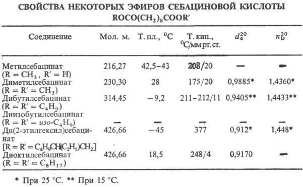 Себациновая кислота обладает хим. св-вами, характерными для карбоновых кислот; образует соли, этерифицируется в моно- и диэфиры. Соли и эфиры себациновой кислоты наз. себацинаты (см. табл.). При восстановлении себациновой кислоты образуется 1,10-декандиол, при действии Вr2 на себацинат Аg-1,8-дибромоктан, при дегидратации аммониевой соли или диамида-себацинодинитрил.