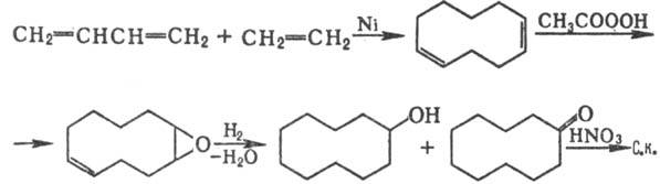Себациновую кислоту можно получить также окислением циклодекана HNO3 или из 1,3-бутадиена и этилена по схеме: