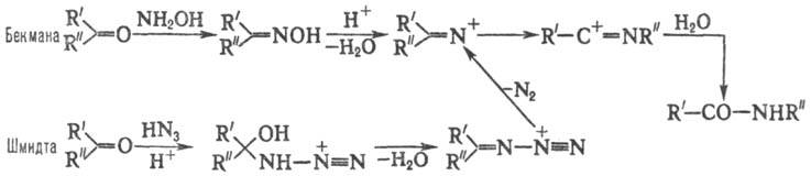 Кислотнокатализируемые перегруппировки Бекмана и Шмидта представляют собой разные способы превращения карбонильных соед. в амиды: