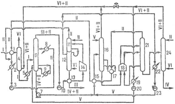 Установка селективной очистки масляного сырья фенолом: 1, 2, 5, 8, 9, 13, 15, 17, 19, 22-теплообменники; 3-емкость для фенола; 4-абсорбер; 6-экстрактор; 7-насос для откачки экстракта; 10-емкость для рафината; 11, 12 и 16, 21, 2.4-колонны для регенерации фенола соотв. из рафината и экстракта; 14, 18-трубчатые печи; 20, 23-емкости для фенольной воды; I-сырье; II-фенол; III-рафинат; IV-экстракт; V-фенольная вода; VI-водяной пар.