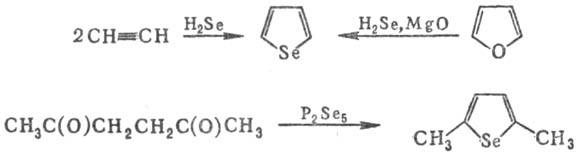 Методы синтеза селенофена и его замещенных: взаимод. парафиновых, этиленовых, ацетиленовых или сопряженных диеновых углеводородов с Se, SeO2, H2Se или (CH3)2Se; замена гетеро-атома в пятичленных гетероциклах на атом Se, циклизация дикарбонильных соед. с P2Se5, напр.: