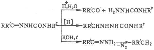 При нагр. с к-тами семикарбазоны разлагаются, легко гидрируются по связи C=N, при нагр. в присут. щелочей или алкоголятов щелочных металлов образуют углеводороды: