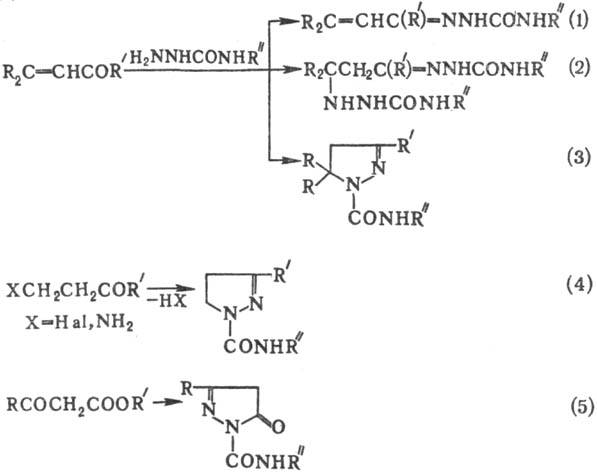 Р-ция имеет ограничения. Так, при взаимод. пергалоген-карбонильных соед. (напр., хлораля, гексафторацетона) с семикарбазидами образующиеся соед. ф-лы II не дегидратируются в условиях р-ции. a,b-Непредельные альдегиды и кетоны в зависимости от условий р-ции дают семикарбазоны (ур-ние 1), семикарбазидосемикарбазоны (2) либо пиразолины (3). b-Галоген- и a-аминокетоны образуют соответствующие пиразолины (4), а производные b-кетокислот-пиразолоны (5):