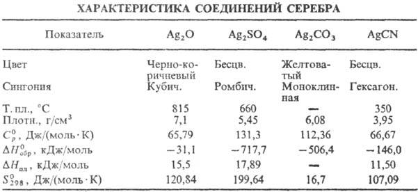 Карбонат Ag2СО3 выше 120 °С разлагается до Ag, CO2 и О2; р-римость в воде 3·10-3 г в 100 г, раств. в водном NH3, цианидах и тиосульфатах щелочных металлов, с карбонатами др. металлов образует двойные карбонаты; получают действием р-ров карбонатов или гидрокарбонатов металлов на AgNO3.