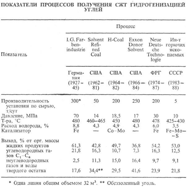Повышение цен на нефть (с 1973) привело к возобновлению интереса к СЖТ. В этот период в большинстве технически развитых стран создаются соответствующие национальные программы исследований. В-результате к нач. 80-х гг. была разработано неск. вариантов усовершенств. технологии ожижения углей, проведенных на крупных опытно-пром. установках производительностью по сырью от 3 до 600 т/сут. В табл. приведена сводка нек-рых процессов, наиб. отработанных в пром-сти или на крупных опытных установках.