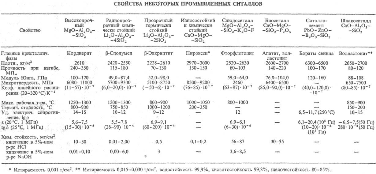 Ситаллы обладают высокой прочностью, твердостью, износостойкостью, малым термич. расширением, хим. и термич. устойчивостью, газо- и влагонепроницаемостью. По своему назначению м. б. разделены на технические и строительные. Технические ситаллы получают на основе систем: Li2O--Al2O3-SiO2, MO-Al2O3-SiO2, Li2O-MO-Al2O3--SiO2, где M-Mg, Ca, Zn, Ba, Sr и др.; MgO-Al2O3--SiO2-K2O-F; MO-B2O3-Al2O3 (где M-Ca, Sr, Pb, Zn); PbO-ZnO-B2O3-Al2O3-SiO2 и др. По осн. св-ву и назначению подразделяются на высокопрочные, радиопрозрачные химически стойкие, прозрачные термостойкие, износостойкие и химически стойкие, фотоситаллы, слюдоси-таллы, биоситаллы, ситаллоцементы, ситаллоэмали, ситаллы со спец. электрич. св-вами.