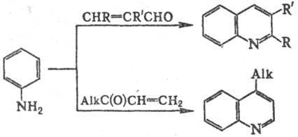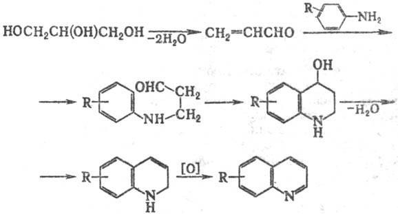 Замена глицерина непосредственно на акролеин обычно приводит к значит. осмолению продуктов. Однако замещенные производные акролеина и их ацетали, винилкетоны, и соед., образующие их в условиях р-ции, реагируют по схеме Скраупа реакции, напр.: