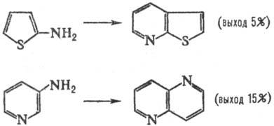 В условиях Скраупа реакции аминопроизводные ряда тиофена, фурана и пиридина частично разлагаются и обычно дают низкие выходы соответствующих; конденсир. гетероциклич. систем, напр.: