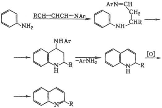Одна из модификаций Скраупа реакции-использование основания Шиффа; в этом случае замыкание цикла сопровождается элиминированием амина вместо Н2О:
