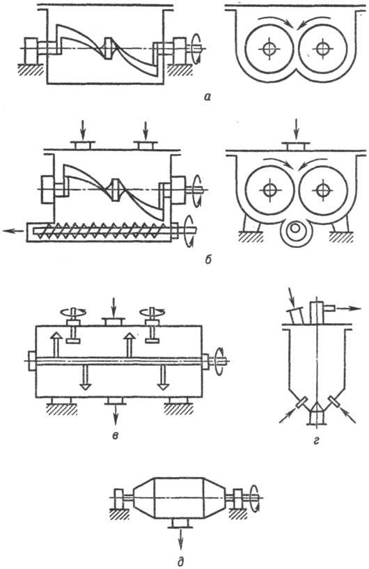 Рис. 2. Аппараты объемного смешения: а-с Z-образными лопастями; б-с Z-образными лопастями и разгрузочным шнеком; в-плужный; г-пневматич. сопловой; д- барабанный.