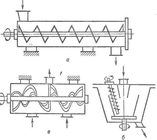 Рис. 3. Аппараты с продольно-радиальным смешением: а-двухшнековый; б-центробежный; в-ленточный.