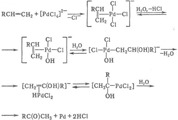 Механизм Смидта реакции включает образование p-комплексов Pd, в к-рых при участии Н2О происходит окисление олефина и восстановление PdCl2; в р-ции участвуют анионы [PdCl4]2-, к-рые образуются при взаимод. PdCl2 с Сl в водной среде: