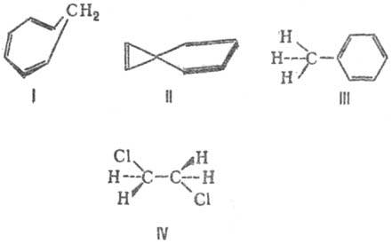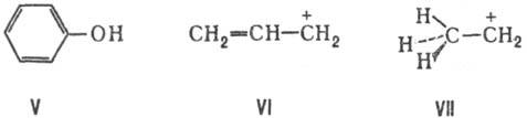 Расширение толкования сопряжения связей связано также с представлениями о сопряжении не только неск. связей, но и кратных (или простых) связей с любым атомным центром-как обладающим одним электроном или неподеленной электронной парой (С-, О, NR2 и др., напр. V), так и центром с вакантной орбиталью (С+ , В, А1 и др., напр. VI и VII). Структурная единица, содержащая сопряженные связи, наз. сопряженной системой.