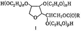 СОРБИТАЛИ (твины), техн. продукты взаимод. сорбитанов с этиленоксидом.Наиб. важны соед. ф-лы I, где R-алкил или алкенил С11 -С17, n + т + p = 5 или 20. Неионогенные ПАВ. Раств. в воде, этаноле, бензоле, толуоле, диоксане, СНС13, не раств. в петролейном эфире, минер. маслах. Критич. концентрация мицеллообразования (ККМ) 0,04-0,1 г/л; гидрофильно-липофильный баланс (ГЛБ) 14-17. Наиб. применение находят сорбитали на основе лауриновой, стеариновой, пальмитиновой и олеиновой к-т.