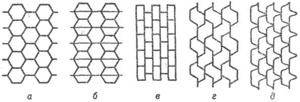 Рис. 1. Формы ячеек сотопласгов: а-шестигранная; б-шестигранная усиленная; в-нрямоугольная; г - шесттранная смещенная; д-гибкая (флексорная).