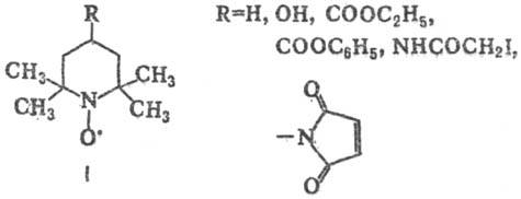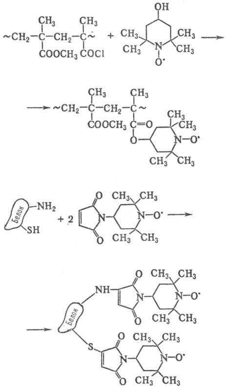 1) Химическая "прививка" нитроксильного радикала к макромолекулам с реакционноспособными группами, как, напр., при получении спин-меченых полиметилметакрилата и белка: