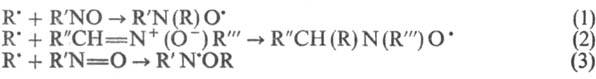 Спектры ЭПР спин-аддуктов характеризуются триплетным сигналом, возникающим в результате взаимод. неспаренного электрона с ядром 14N. В зависимости от заместителей при атоме N константа сверхтонкого взаимод. aN для разл. нитроксилов изменяется в довольно широких пределах: от 0,4-0,5 мТл (в случае диацилнитроксилов) до 2,4-2,8 мТл (в случае алкоксиалкилнитроксилов). Поэтому значения aN для разл. спин-аддуктов могут дать информацию о природе короткоживущего радикала. Кроме того, если в a- и b-поло-жениях к атому N находятся ядра с отличным от нуля спином, то в спектре ЭПР спин-аддукта наблюдается дополнит. расщепление линий осн. триплета благодаря взаимод. неспаренного электрона с этими ядрами.