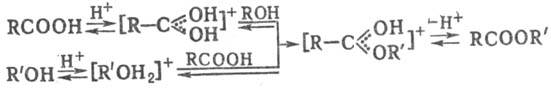 При взаимодействии спиртов с карбоновыми к-тами образуются сложные эфиры: р-цию проводят в избытке спирта с одновременным удалением воды в присут. катализаторов (НС1, BF3, H2SO4 и др.); в случае первичных и вторичных спиртов катализатор активирует к-ту, в случае третичных-спирт: