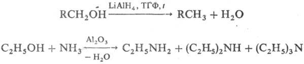 Восстановление спиртов приводит к углеводородам, действие NH3-к аминам (последнюю р-цкю используют в пром-сти для получения низших алифатич. аминов), напр.: