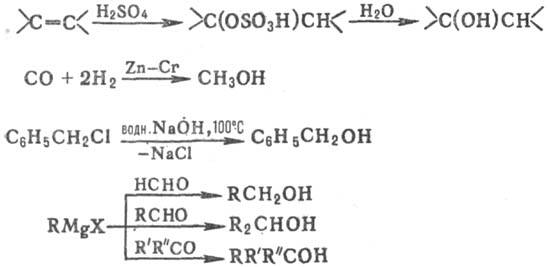 Получение. Получают спирты гидратацией олефинов и присут. H2SO4 или Н3РО4 (в осн. алканолы С2—С4); восстановлением СО на катализаторах Zn—Сг при т-ре 300-400 °С и давлении 25-45 МПа (наряду с СН,ОН образуются С3Н7ОН, изо-С4Н9ОН и алканолы С5-С14); гидролизом галогенсодержащих соед.; взаимод. карбонильных соед. с реактивами Гриньяра, напр.: