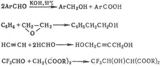 Первичные спирты (в т. ч. ароматические) образуются по р-ции Канниццаро либо при взаимод. бензола с алкеноксидами в присут. АlСl3 в условиях р-ции Фриделя-Крафтса; ацетиленовые-по р-ции Реппе; гидроксиэфиры-в условиях р-ции Кнёвенагеля, напр.: