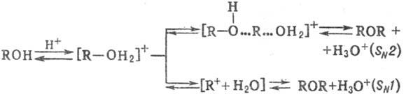 Р-ция образования простых эфиров может протекать по механизмам SN2 (R и R'-первичный алкил) либо SN1 (R-mpem-алкил, аллил, бензил) в зависимости от легкости образования карбкатиона; для р-ций, протекающих по механизму SN1, используют мягкие условия (разб. к-ты, по-ниж. т-ру) во избежание дегидратации до олефинов. Дегидратация под действием сильных минер. к-т идет и в случае первичных или вторичных спиртов.