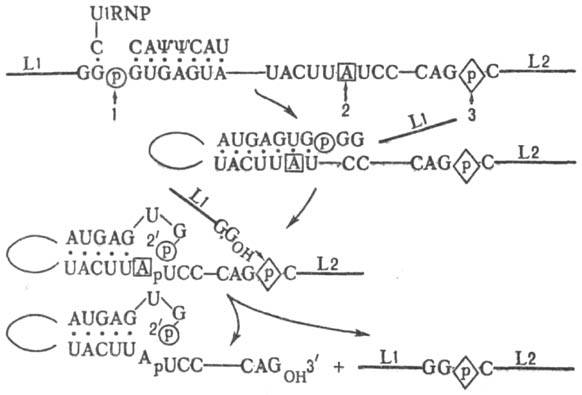 Сплайсинг пре-мРНК, находящихся в ядре, происходит в составе специфич. нуклеопротеидных частицах (сплайсомах). Обычно сплайсингу подвергается кэпированная полиаденилированная линейная пре-мРНК. К.-л. строгого порядка для удаления множественных интронов из пре-мРНК не наблюдается, хотя удаление одних интронов может происходить быстрее, чем других. Сплайсинг происходит исключительно в ядре; несплай-сированная РНК остается в ядре и деградирует. Однако если пре-РНК содержит интрон, к-рый может участвовать в альтернативном пути сплайсинга (см. ниже), то она м. б. транспортирована в цитоплазму. Сплайсинг ядерных пре-мРНК происходит обычно по границам интронов, к-рые содержат на концах динуклеотиды 5'-GU и AG-3' (A, G и U-соотв. остатки аденозина, гуанозина и уридина; правило Шамбо-на). Известно только неск. исключений, когда вместо GU расположен динуклеотид GC (С-остаток цитидина). Рядом с этими динуклеотидами расположены т. наз. консенсусные· последовательности, к-рые имеют близкое строение у разл. пре-мРНК. Общая схема сплайсинга ядерных пре-мРНК показана на рис. 2.