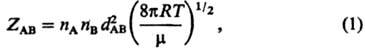 где nА, nв- концентрации молекул А и В (число соответствующих молекул в единице объема), dАВ = 1/2(dA + dB)-средний диаметр сталкивающихся молекул, m = mA mB/(mA + + mB)-приведенная масса молекул А и В, R-газовая постоянная, Т-абс. т-ра.