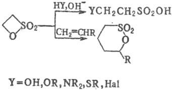 Сультоны-жидкости или твердые в-ва. Водородсодержащие b-сультоны неустойчивы, выше 0°С изоме-ризуются с образованием a,b- или b,g-ненасыщ. сульфо-кислот; в присут. оснований легко взаимод. с нуклеоф. реагентами; присоединяются к олефинам с образованием d-сультонов, напр.: