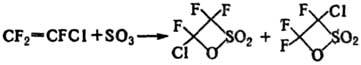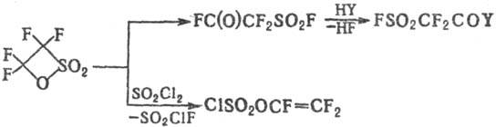 Галогенсодержащие b-сультоны (особенно при X = F)-устойчивые соединения; в р-циях с нуклеоф. реагентами претерпевают анионотропные превращения, образуя производные a-фторсульфонилкарбоновых к-т; с электроф. реагентами образуются производные полифторалкенилсер-ных к-т, напр.: