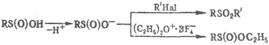 Под действием окислителей (Н2О2, HNO3, I2, гипохло-риты, КМnО4 и др.) сульфиновые кислоты образуют сульфокислоты RSO2OH. Восстановление приводит, в зависимости от условий р-ции, к тиолам, дисульфидам или S-эфирам тиосульфокислот: