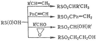 Присоединение сульфиновых кислот по кратным связям алкенов, алленов, ацетиленов приводит к соответствующим сульфонам; взаи-мод. с альдегидами-к a-гидроксисульфонам, с эпоксидами в присут. оснований-к b-гидроксисульфонам, напр.: