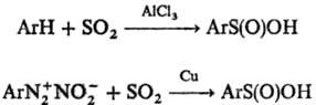 Ароматические сульфиновые кислоты получают также сульфинированием ароматич. углеводородов в условиях р-ции Фриделя-Крафт-са или разложением диазониевых солей в присут. SO2 и Сu: