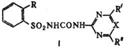 Сульфонилмочевины-эффективные гербициды. Наиб. активны соед. ф-лы I (см. табл.): хлорсульфурон (R = CI, R' = ОСН3, R: = СН3, X = N), метсульфуронметил (R = СООСН3, R' = ОСН3, R: = СН3, X = N), сульфометуронметил (R = СООСН3, R' = R: = СН3, X = СН), хлоримуронэтил (R = СООС2Н5, R' = CI, R: = OСH3,X = СH трисульфурон (R = ОСН2СН2СI, R' = СН3, R: = ОСН3, X = СН). Их используют для борьбы с двудольными сорняками в посевах зерновых культур, кукурузы, льна, сои и др. Нек-рые сульфонилмочевины-антидиабетические средства.