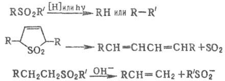 Сульфоны элиминируют молекулу SO2 при УФ облучении или нагр., а также при действии нек-рых восстановителей; в щелочных условиях сульфоны подвергаются 1,2-элиминированию с образованием сульфинат-ионов, напр.: