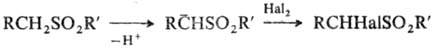 Сульфоны легко генерируют a-сульфонилкарбанионы, к-рые являются синтетич. интермедиатами в р-циях галогенирова-ния, алкилирования и др.: