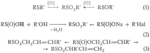 Получают сульфоны окислением сульфидов или сульфоксидов (окислители-Н2О2 в СН3СООН, м-хлорнадбензойная к-та, KMnO4, Na2Cr2O7 и др., р-ция 1); алкилированием сульфи-новых к-т или сульфинатов (2); термич. перегруппировкой аллилсульфинатов, при этом может образовываться два разл. продукта (3), напр.: