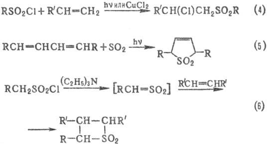 Сульфоны получают также свободнорадикальным присоединением сульфонилгалогенидов к ненасыщ. соединениям (4); цик-лоприсоединением SO2 к диенам (5); взаимод. сульфенов, генерируемых из алкансульфонилхлоридов, с алкенами (6), напр.: