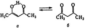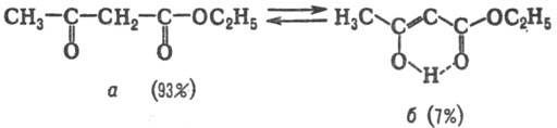 Для нек-рых 1,3-дикарбонильных соед. таутомерные превращения происходят со столь низкими скоростями, что таутомеры м.б. разделены при обычных т-рах, как, напр., ацетоуксусный эфир, к-рый в результате прототропии является смесью двух таутомеров-кетонной (а) и енольной (б)форм: