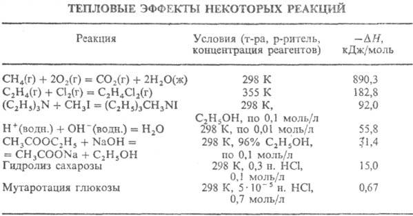 Изучение тепловых эффектов реакций составляет важнейшую задачу термохимии. Осн. эксперим. метод -калориметрия. Совр. аппаратура позволяет изучать тепловые эффекты реакций в газовой, жидкой и твердой фазах, на границе раздела фаз, а также в сложных биол. системах. Диапазон типичных значений измеряемых тепловых эффектов реакций составляет от сотен Дж/моль до сотен кДж/моль. В табл. приводятся данные калориметрич. измерений тепловых эффектов нек-рых р-ций. Измерение тепловых эффектов смешения, растворения, разведения, а также теплот фазовых переходов позволяет перейти от реально измеренных тепловых эффектов реакций к стандартным.