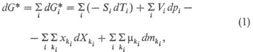 В каждый момент времени система (или одна из подсистем) м. б. охарактеризована средними удельными (по объему или по массе) ф-циями состояния, стремящимися к экстремуму при достижении равновесия (обладающими экстремальными св-вами). Изменение состояния системы (подсистемы) во времени (эволюция системы) исследуется по изменениям этих ф-ций. Используется гл. обр. ф-ция Гиббса (энергия Гиббса) G*(p, Т, Хi), где p -давление, Т-т-ра, Xi-обобщенная сила (любой интенсивный параметр состояния, за исключением давления); для сложной системы G* = U + pV— Xixi — TS, где U- внутр. энергия, V- объем, хi - обобщенная координата (любой экстенсивный параметр состояния, за исключением объема), S-энтропия; величины p, T и Xi являются естественными независимыми переменными ф-ции G*. Для открытой системы полный дифференциал dG* записывается в виде: