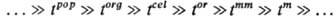 Примером прир. иерархич. системы является биол. популяция pop (сообщество организмов), в к-рой можно выделить след. подсистемы: организмы org, клетки cel, надмолекулярные образования or, макромолекулы mm, молекулы m и т. д. Все эти подсистемы соподчиненно (иерархически) расположены в пространстве и обладают иерархией времен релаксации ti (характерных времен жизни), а именно эти времена, связанные сильными неравенствами и расположенные в порядке возрастания (или убывания), образуют иерархич. ряд: