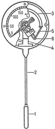 Рис.2. Манометрич. термометр: 1 - термобаллон; 2-капилляр; 3-трубчатая пружина; 4-держатель; 5-поводок; 6-сектор (4-6-передаточный механизм).