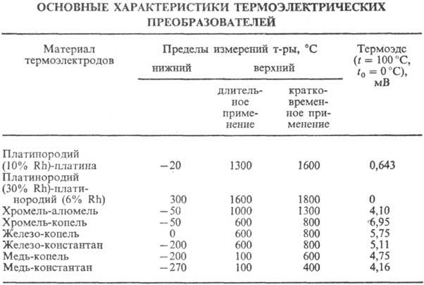 Проволочные термоэлектроды ТЭП помещают в стальной или керамич. чехол, подключая своб. концы к выводамс крышкой; изолируют один от другого по всей длине от горячего спая керамич. изоляторами (рис. 5,6). Рабочий спай изолируют от чехла керамич. наконечником. Горячую часть ТЭП (со стороны рабочего спая) погружают в объект измерения т-ры. Стандартные ТЭП имеют разл. конструкт тивные исполнения и могут отличаться след. признаками: способами контакта с исследуемой средой (погружные и поверхностные) и защиты от мех. повреждений и хим. воздействия контролируемой среды; инерционностью; числом зон контроля т-ры в объекте (одно- и многозонные); числом рабочих спаев (одинарные, двойные); длиной погружаемой части и т. д. Осн. характеристики наиб. распространенных ТЭП приведены в таблице. Все большее применение находят преобразователи, изготовленные из спец. кабеля,-бронированные оболочковые, или кабельные. Для измерений термоэдс ТЭП работают в комплекте с вторичными приборами (милливольтметры, потенциометры и др.). ТЭП широко используют в устройствах для измерений т-ры в разл. автоматизир. системах управления и контроля.